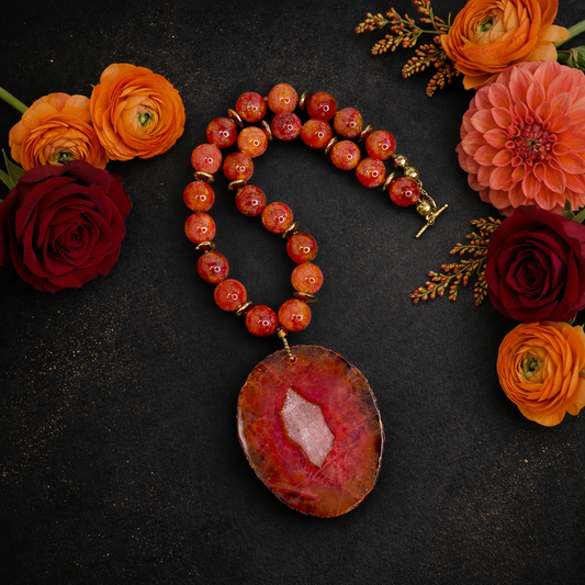 Solar Ember Agate Gemstone Beaded Necklace with Druzy Pendant & Gold Hematite Spacers